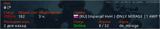 Играет на Counter Strike Global Offensive сервере. Страна: РоссияПервый раз замечен 03:17 09.08.2025