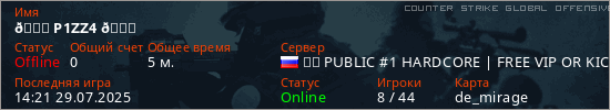 Играет на Counter Strike Global Offensive сервере. Страна: РоссияПервый раз замечен 13:44 29.07.2025