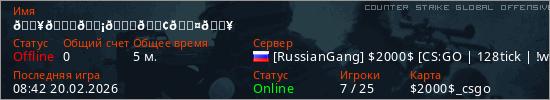 Играет на Counter Strike Global Offensive сервере. Страна: РоссияПервый раз замечен 08:27 20.02.2026