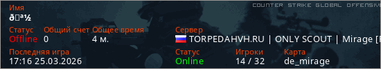 Играет на Counter Strike Global Offensive сервере. Страна: РоссияПервый раз замечен 17:12 25.03.2026