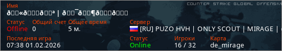 Играет на Counter Strike Global Offensive сервере. Страна: РоссияПервый раз замечен 07:28 01.02.2026