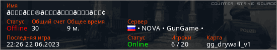 Играет на Counter Strike Source сервере. Страна: РоссияПервый раз замечен 22:12 22.06.2023