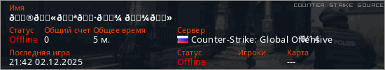 Играет на Counter Strike Source сервере. Страна: РоссияПервый раз замечен 21:30 02.12.2025