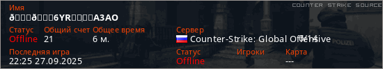 Играет на Counter Strike Source сервере. Страна: РоссияПервый раз замечен 21:46 27.09.2025