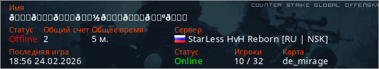 Играет на Counter Strike Global Offensive сервере. Страна: РоссияПервый раз замечен 18:54 24.02.2026