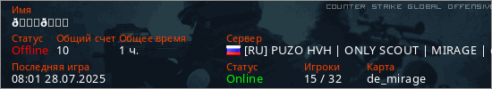Играет на Counter Strike Global Offensive сервере. Страна: РоссияПервый раз замечен 04:34 26.07.2025