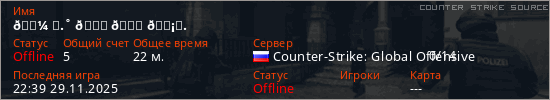 Играет на Counter Strike Source сервере. Страна: РоссияПервый раз замечен 23:18 27.11.2025