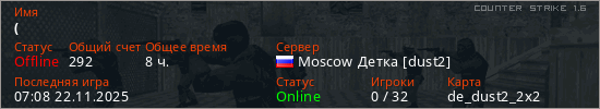 Играет на Counter Strike 1.6 сервере. Страна: РоссияПервый раз замечен 15:01 31.07.2020