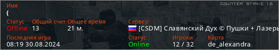 Последний раз был в сети 08:19 30.08.2024 Игрок с таким ником замечен на 42 серверах