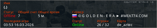 Играет на Counter Strike 1.6 сервере. Страна: РоссияПервый раз замечен 03:28 16.03.2026