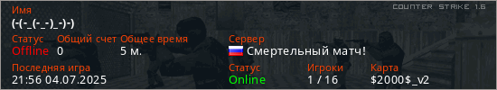 Играет на Counter Strike 1.6 сервере. Страна: РоссияПервый раз замечен 21:33 04.07.2025