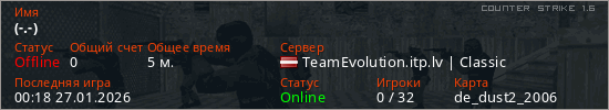 Играет на Counter Strike 1.6 сервере. Страна: ЛатвияПервый раз замечен 00:16 27.01.2026