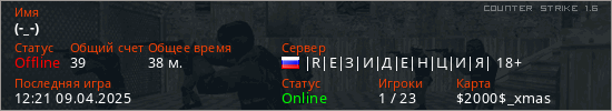 Играет на Counter Strike 1.6 сервере. Страна: РоссияПервый раз замечен 01:47 21.05.2024