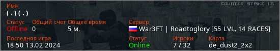 Играет на Counter Strike 1.6 сервере. Страна: РоссияПервый раз замечен 18:27 13.02.2024