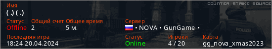 Играет на Counter Strike Source сервере. Страна: РоссияПервый раз замечен 18:03 20.04.2024