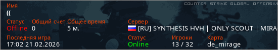 Играет на Counter Strike Global Offensive сервере. Страна: РоссияПервый раз замечен 16:35 21.02.2026
