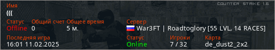 Играет на Counter Strike 1.6 сервере. Страна: РоссияПервый раз замечен 15:53 11.02.2025