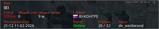 Играет на Counter Strike 1.6 сервере. Страна: РоссияПервый раз замечен 21:29 10.02.2026