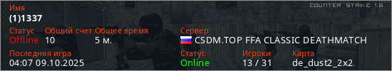 Играет на Counter Strike 1.6 сервере. Страна: РоссияПервый раз замечен 04:05 09.10.2025