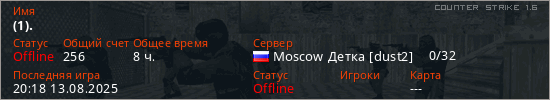 Играет на Counter Strike 1.6 сервере. Страна: РоссияПервый раз замечен 19:49 15.10.2020
