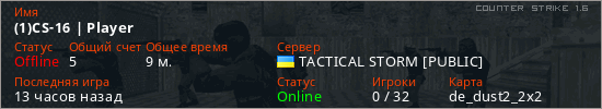 Играет на Counter Strike 1.6 сервере. Страна: УкраинаПервый раз замечен 13:08 22.04.2026