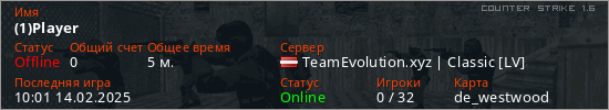 Играет на Counter Strike 1.6 сервере. Страна: ЛатвияПервый раз замечен 09:51 14.02.2025
