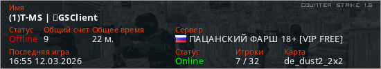 Играет на Counter Strike 1.6 сервере. Страна: РоссияПервый раз замечен 13:46 07.03.2026