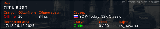 Играет на Counter Strike Source сервере. Страна: РоссияПервый раз замечен 14:09 25.12.2025