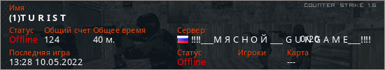 Играет на Counter Strike 1.6 сервере. Страна: РоссияПервый раз замечен 12:49 10.05.2022