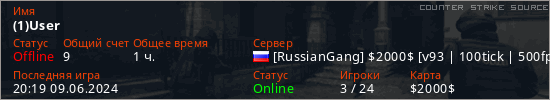 Играет на Counter Strike Source сервере. Страна: РоссияПервый раз замечен 19:38 05.04.2023