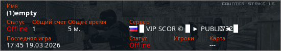 Играет на Counter Strike 1.6 сервере. Страна: РоссияПервый раз замечен 17:40 19.03.2026