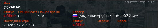 Играет на Counter Strike 1.6 сервере. Страна: РоссияПервый раз замечен 17:35 31.10.2023