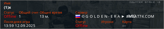 Играет на Counter Strike 1.6 сервере. Страна: РоссияПервый раз замечен 22:26 01.01.2025