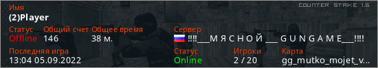 Играет на Counter Strike 1.6 сервере. Страна: РоссияПервый раз замечен 12:29 05.09.2022