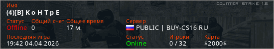 Играет на Counter Strike 1.6 сервере. Страна: РоссияПервый раз замечен 18:08 15.03.2026