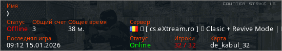 Играет на Counter Strike 1.6 сервере. Страна: РумынияПервый раз замечен 01:52 03.01.2025