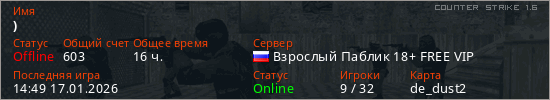 Последний раз был в сети 14:49 17.01.2026 Игрок с таким ником замечен на 51 сервере