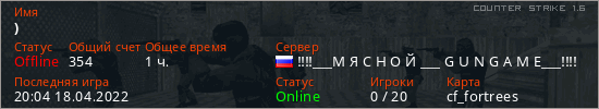 Играет на Counter Strike 1.6 сервере. Страна: РоссияПервый раз замечен 20:34 01.04.2022
