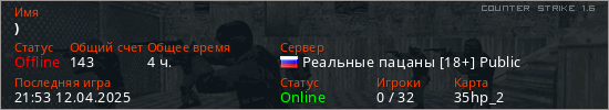 Последний раз был в сети 21:53 12.04.2025 Игрок с таким ником замечен на 50 серверах