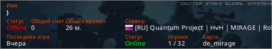 Играет на Counter Strike Global Offensive сервере. Страна: РоссияПервый раз замечен 20:45 22.02.2026