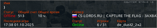 Последний раз был в сети 17:38 01.10.2025 Игрок с таким ником замечен на 51 сервере