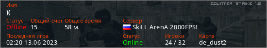 Играет на Counter Strike 1.6 сервере. Страна: РоссияПервый раз замечен 21:44 13.07.2022