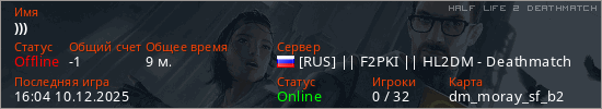 Играет на Half Life 2 DeathMatch сервере. Страна: РоссияПервый раз замечен 00:42 10.12.2025