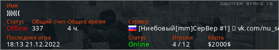 Играет на Counter Strike 1.6 сервере. Страна: РоссияПервый раз замечен 14:55 04.11.2022