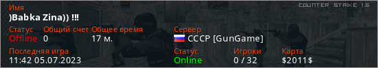 Играет на Counter Strike 1.6 сервере. Страна: РоссияПервый раз замечен 00:25 21.06.2023