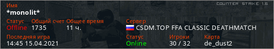 Играет на Counter Strike 1.6 сервере. Страна: РоссияПервый раз замечен 22:38 17.12.2019