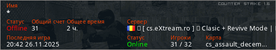 Играет на Counter Strike 1.6 сервере. Страна: РумынияПервый раз замечен 00:27 04.11.2024