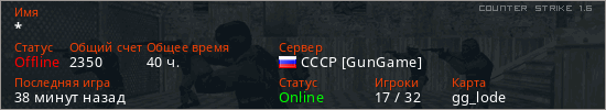 Играет на Counter Strike 1.6 сервере. Страна: РоссияПервый раз замечен 15:33 31.05.2023