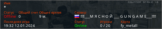 Играет на Counter Strike 1.6 сервере. Страна: РоссияПервый раз замечен 03:30 22.02.2023
