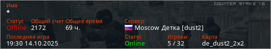 Играет на Counter Strike 1.6 сервере. Страна: РоссияПервый раз замечен 14:57 31.07.2020
